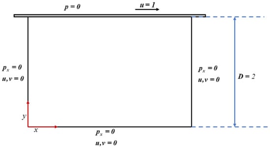 where denotes the Reynolds number. u and v represent the x-direction and y-direction of the velocity flied, respectively; p the pressure field. The scenario of the 2-D cavity flow and the boundary conditions can be viewed in Figure 7. The boundary conditions of the top cover, pressure is zero and x-direction velocity is 1, while that of the other three boundaries, the first derivative of pressure in x direction is zero and two direction velocities are also zero.