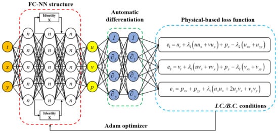 The N-S equations, Mass conservation equation and boundary condition are embedded into the loss function. The first and second derivative terms of velocity and pressure are calculated directly by automatic differentiation. It is worth emphasizing that automatic differentiation is a method between symbolic differentiation and numerical differentiation. Numerical differentiation emphasizes directly substituting into numerical approximate solution at the beginning while symbolic differentiation emphasizes solving algebra directly before substituting numerical. Automatic differentiation applies symbolic differentiation to the most basic operators, such as constant, power function, exponential function, logarithmic function, trigonometric function, etc., and then substituting it into the numerical value, retaining the intermediate result, and finally applying it to the whole function. Therefore, the automatic differentiation can avoid truncation and round-off errors effectively [28]. In this paper, the automatic differentiation technique is carried out by the Pytorch framework. The Adam algorithm is adopted to optimize the loss function and the more information on this method is introduced in Section 3.2.