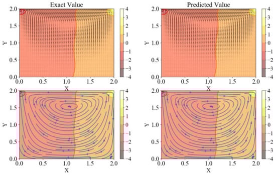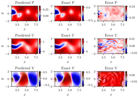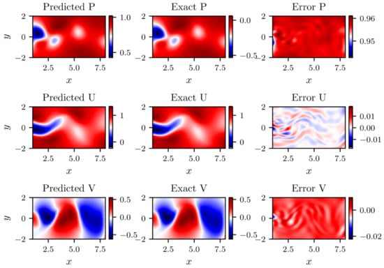 In addition, the predicted results against real instantaneous flow field at a certain time with clean data and noise data can be demonstrated in Figure 13 and Figure 14. It can be viewed that the prediction of the stream-wise velocity and transverse-wise velocity is pretty accuracy, the biggest errors in entire flow filed for stream-wise velocity and transverse-wise velocity are 0.98% and 3.1% in clean data while that are 0.99% and 3.1% in noise data, respectively. It is noteworthy that the Res-PINN also enjoys the ability to reconstruct the whole pressure field although the training data on the pressure field is absent. A strange phenomenon that the difference in magnitude between the predicted pressure and exact, although the distribution of the pressure filed is almost same. It is validated by the law of the N-S equation due to the pressure field is only recognizable up to a fixed value. For the incompressible flow, the absolute value of the pressure is of no great important.