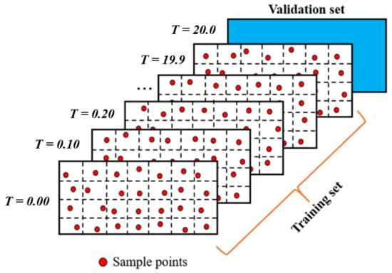 In this section, Latin hypercube sampling (LHS) is selected to obtain the training set. LHS is a kind of approximate random sampling method from multivariate parameter distribution. It belongs to stratified sampling technology and is often used in computer experiments or Monte Carlo integration. The training data is obtained from T = 0.0 to T = 19.9 with 0.1 interval while the validation data is obtained at T = 20. The specific sampling method is shown in Figure 11. The time and space coordinates are selected as input and the velocities are selected as output. In this example, the pressure is seemed as an unknown value that need to be identified. What’s more, the unknown parameters, non-dimension coefficients, are also calculated to validate the performance the Res-PINN. The physical-based loss functions include the conservation equation and N-S equations are gradient computed by Adam optimizer. The structure of neural network is 9 hidden layers with 20 neurons each layer, the Res-PINN and PINN are compared in 4000 samples. The steam-wise and transverse-wise velocity are also imposed by 1% uncorrelated Gaussian noise to validate that the Res-PINN proposed in this paper can also has a good performance to filter the noise. The detailed N-S equations are informed into neural network (flow past cylinder) which can be viewed in Figure 12.
