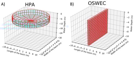 To assess the importance of the numerical approach used to study the “far-field” effects of WEC farms and the required level of detail needed when modelling the WEC hydrodynamic interactions and the PTO systems, different WEC farms and wave conditions were selected. As indicated in Reference [58], there is a vast range of WECs under development; therefore, for this study, two of the most common WEC types were selected: a heaving point absorber (HPA) and an oscillating surge wave energy converter (OSWEC). This selection also allows us to consider two possible deployment scenarios: one offshore for the HPAs as they would typically be deployed at water depths of around 30 m; and another deployment scenario in the nearshore, as the OSWECs are likely to be deployed at water depths of around 10 m. This selection aims to assess the potential coastal impacts that a WEC farm project can have when deployed close to or far from the coast.