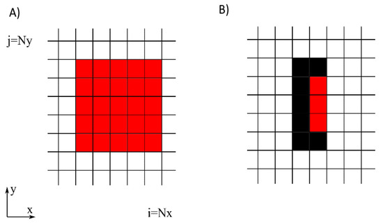 Detail from the sponge layer technique employed in MILDwave to mimic the behaviour of the WEC. In Subplot (A), the HPA WEC is represented by an = 5 × = 5 cell grid configuration. In Subplot (B), the OSWEC is represented by an = 2 × = 5 grid cell configuration. Black cells indicate fully reflective cells, while the red cells are assigned a specific wave absorption coefficient.