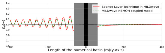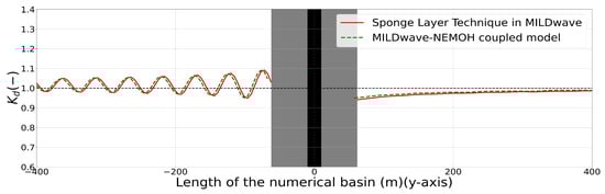 Kd disturbance coefficient results for the MILDwave-NEMOH coupled model and the MILDwave sponge layer technique along one longitudinal cross-section at the centre of the domain for a single OSWEC interacting with regular waves of H = 2 m and T = 8 s. The coupling region is filled in grey colour and includes the WEC’s cross-section indicated by a black vertical area. Incident waves are generated from the left to the right.