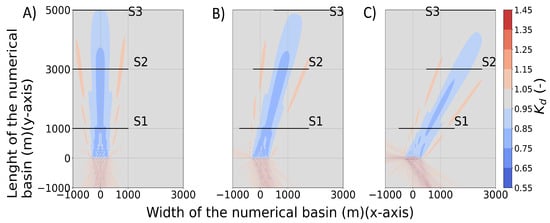 disturbance coefficient results for a 21 HPA WEC farm interacting with regular waves of m, s and (A) = 0°, (B) 15° and (C) 30° in the MILDwave-NEMOH coupled model. S1, S2 and S3 indicate the locations of the cross-sections. Contour levels are set at an interval of 0.05 for the value. The water depth is 30 m. Waves are generated along the bottom boundary.