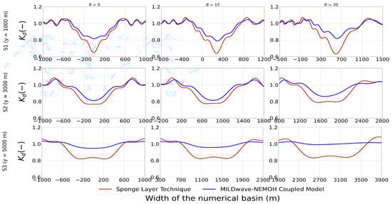 Figure 7 shows results at three transversal cross-sections (indicated in Figure 6) at y = 1000 m (S1), at y = 3000 m (S2) and at y = 5000 m (S3), for the MILDwave-NEMOH coupled model and the sponge layer technique, respectively, for a WEC farm of 21 HPA interacting with a regular wave with m and s. It can be noticed that both modelling approaches have the same behaviour in terms of wave height reduction in the direct lee of the WEC farm and with regard to the wave attenuation with the separating distance of the WECs in the WEC farm. Nevertheless, the order of the magnitude of this wave height reduction is higher when the sponge layer technique is applied. At a distance of 1000 m in the lee of the WEC farm, the wave height reduction reaches 30%. This wave height reduction goes down faster than in the MILDwave-NEMOH coupled model at a distance of 3000 m, reaching a 22% reduction of the wave height. However, at a distance of 5000 m, this reduction still remains at 17%.