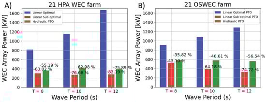 Bar charts showing the average power output for (A) a 21 HPA WEC farm (left) and (B) a 21 OSWEC farm (right) with a linear optimal PTO (blue, first bar), a linear sub-optimal PTO (red, second) and a hydraulic PTO (green, third bar). The percentage difference between the linear optimal PTO and the linear sub-optimal and hydraulic PTOs, respectively, is shown at the top of the bars.