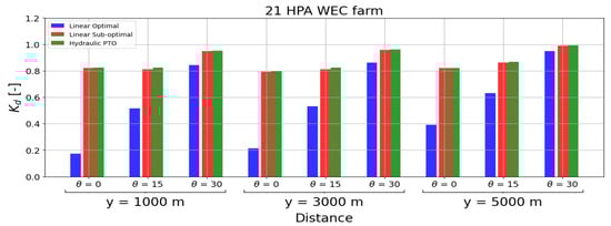 In this section, the interplay between the three PTO systems, the average power output and the “far-field” effects of the WEC farms is studied. Primarily, the linear optimal PTO system impact at a distance of y = 1000 m (S1) in the lee of the WEC farm is much higher than for the linear sub-optimal and hydraulic PTOs. This is aligned with a higher average power output, as seen in Figure 8, especially for the cases of s and s. Contrary to the optimal PTO system, the sub-optimal and hydraulic PTO systems have very similar values at y = 1000 m (S1) for all the test cases, with a very different behaviour in the power output. For both PTO systems, it can be observed that is increased with an increase of both the wave period and the incident wave angle. This matches a reduction of the average power output of the WEC farms, as seen in Table 3 and Table 4. Yet, the values for both the sub-optimal and hydraulic PTO are very similar. As shown in Figure 8, the hydraulic PTO system consistently gives on average a greater power output than the sub-optimal PTO system for both the HPA and OSWEC farms. At larger distances from the WEC farms (y = 3000 (S2) and y = 5000 m (S3)), the values are almost close to one, indicating that for these two PTO systems, the WEC farm performance due to a change in the PTO has no impact on the “far-field”. However, for the optimal PTO system, there is a meaningful impact on the “far-field” with a magnitude around 0.4. Nevertheless, this magnitude is increasing rapidly with the distance to the WEC farm, indicating that the larger the distance to the WEC farm, the lower the WEC farm impact on the wave field is.