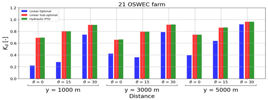 disturbance coefficient for a farm of 21 OSWECs for a linear optimal, a linear sub-optimal and a hydraulic PTO systems, at a distance of y = 1000 m (S1), y = 3000 m (S2) and y = 5000 m (S3) in the lee of the WEC farm, respectively.