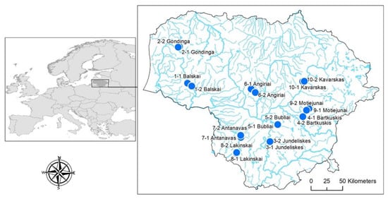 Surveys of physico-chemical quality indicators and suspended solids were performed in January–December 2015, while benthic macroinvertebrates and fish studies were performed in August–September 2015. Ten small hydropower plants were selected in different parts of Lithuania. Figure 1 shows the areas where the studies were performed.