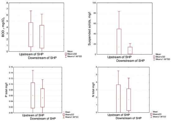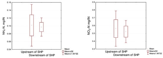 By evaluating the values of water indicators below and above the small hydropower plants, it was found that the values above the hydropower plants are higher than those below the hydropower plants, although Student’s t value, which shows the differences between the values, was found to be insignificant (p > 0.05). This shows that hydropower plants do not have a negative impact on the physico-chemical values of water quality indicators. Higher values of these indicators are generally considered to indicate poorer conditions, so the differences, although not significant, suggest conditions downstream of SHPs are better than upstream of the SHP.