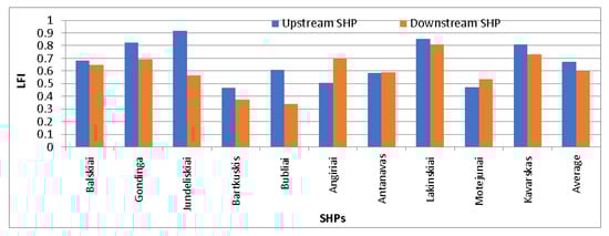 LFI values can range from 0 to 1 with 0 being worst and 1 being best condition. In 7 out of 10 SHPs, the ecological status according to the LFI downstream from the SHP was found to be worse than that upstream (Balskai, Gondinga, Jundeliškės, Bartkuškis, Bubliai, Kavarskas and Lakinskai). Mean LFI values also were higher upstream than downstream of SHPs.