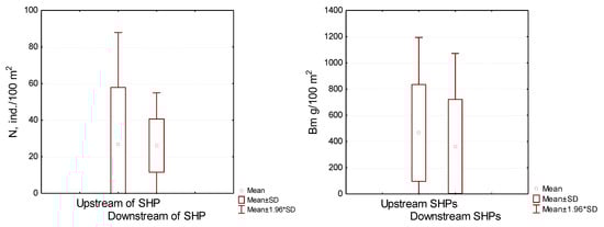 Fish abundance (N, ind./100 m2) (individuals/100 m2) and biomass (Bm, g/100 m2) upstream and downstream from the SHPs.