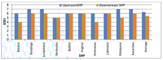 DSFI values can range from 0 to 1, with 0 being worst and 1 being best condition. The results of the research showed that out of the 10 SHPs, seven (the Balskai, Gondinga, Jundeliškės, Motiejūnai, Kavarskas and Antanavas SHPs) featured DSFI values downstream from the SHPs that were worse than those upstream. However, the ecological status according to the DSFI downstream from the SHPs was only three points worse than that upstream. The mean DSFI values were also found to be worse downstream from the SHPs.