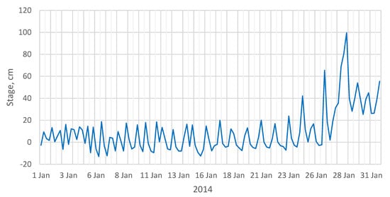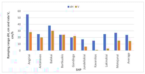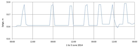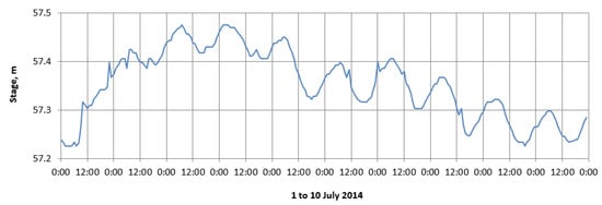 Many metrics were used to describe the hydropeaking or hydrograph ramping due to operations of water turbines [,,]. The main metrics that were clearly observed in the lower reaches of the river (and that were considered in this study) were the range of water levels (the difference between the base-flow and peak-flow or their ratios), the rate at which the water levels rise and fall, and the distance after which the ramping almost disappears.