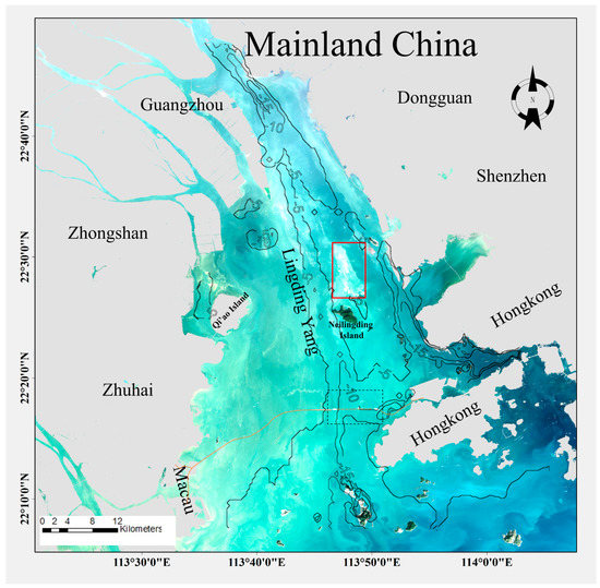 The Pearl River is the second largest river in China after the Yangtze River in terms of volume [1]. The Pearl River is more than 2000 kilometers long, and it passes through several large cities before entering the South China Sea (Figure 1). Lingding Yang is one of the main estuaries of the Pearl River and is approximately 60 km wide, with Hong Kong to the east and Macau to the west. The sediment in Lingding Yang is affected by a number of factors, including the topography, tides, runoff, and human activities [2]. For example, the topography of the three troughs in Lingding Yang has formed the dynamic water environment and produced the increasing trend of suspended sediment concentration from the southeast to the northwest [3]. Lingding Yang has an irregular half-day tide, with two high tides and low tides during the day. The average tidal range is from 0.86~1.63 m, which is categorized as a weak tide estuary, and the M2 sub-tide dominates [4]. The amount of sediment transported by Lingding Yang has a significant seasonal variability due to runoff, with approximately 95% of transport occurring from April to September [5].