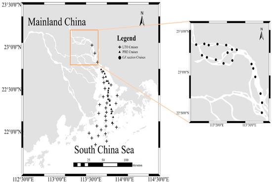 The sample stations of the three cruise routes used in this study; the plus sign represents the LTO cruise stations, the triangles represent the stations of the Pearl River Estuary cruises, and the solid circles represent the stations of Guangzhou Section cruises.