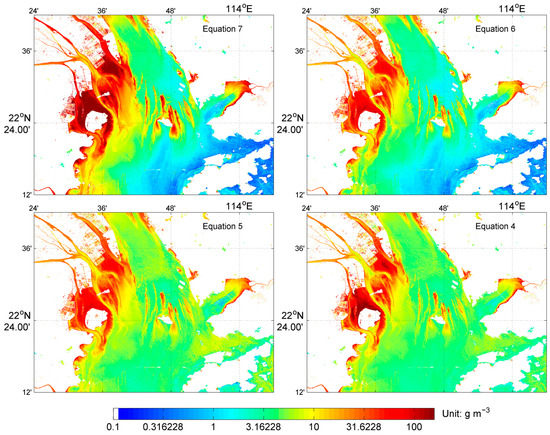 The suspended sediment distribution derived using different algorithms (Equations (7) to Equation (4)). The scene was captured on 16 November 2014.
