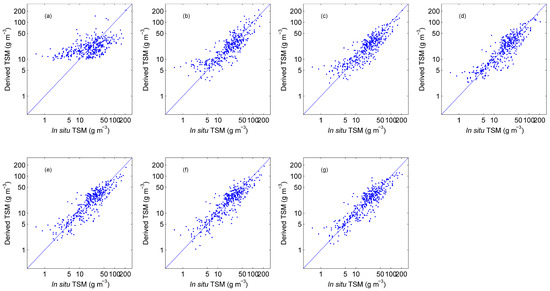 The scatter plots of the derived suspended sediment concentrations and the measured suspended sediment concentrations. The derived total suspended matter (TSM) concentrations in (a–f) and (g) were obtained from Equations (1) to (7), respectively.