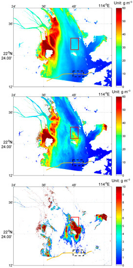 Mean suspended sediment concentrations during the weak/no excavation period (top); mean suspended sediment concentrations during the strong excavation period (middle); the difference between the mean suspended sediment concentrations during the strong excavation period and the weak/no excavation period. The red rectangle is the permitted sand excavation region, and the black rectangle is the tunnel construction area. The solid orange line is the bridge, and the dotted orange line is the undersea tunnel.