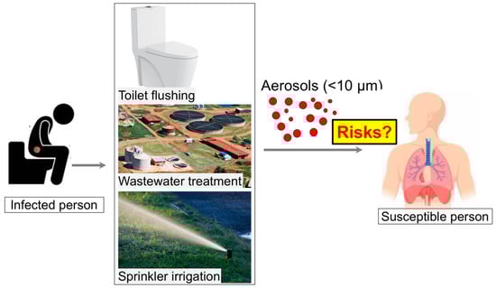 Although there is currently no proof of wastewater-related exposure to SARS-CoV-2, the contribution of aerosolized wastewater as a transmission route was recognized during the SARS epidemic of 2003 []. Respiration of virus-laden aerosols, created through the defective plumbing and sewage system, was recognized as a potential transmission route within a housing complex in Hong Kong where 187 people were infected []. Therefore, the transmission of this virus in aerosolized wastewater remains a significant possibility in the following scenarios: toilet flushing, wastewater treatment, and sprinkler irrigation (Figure 1). These scenarios are briefly described in the following sections.