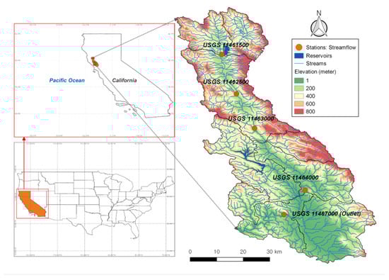 The Russian River basin (latitude 39.38° N, longitude −123.23° W) is located in northern California. The drainage area of Russian River basin is 3846 km2 (Figure 1), covering northern Sonoma County and southern Mendocino County. Due to the unique geography and proximity to the coast, the Russian River basin has challenges related to flood mitigation, water resource management, water quality, and soil erosions [45]. In addition, this area has a complex terrain with the land cover/use dominated by evergreen forest, deciduous forest, shrub/scrub, and grassland [45]. In this area are located two reservoirs, Mendocino and Sonoma, which are regulated by the Coyote Valley and Warm Springs dams. The Russian River basin is located on the west coast of the United States with an average annual precipitation of 1180 mm and more than 80% of its annual precipitation was observed during wet season (from November to March). The Russian River basin is affected by various meteorological factors such as extratropical cyclones, jet streams, and atmospheric rivers from the Pacific oceans [46]. For runoff forecasting at outlet point, hourly runoff data were obtained from five United States Geological Survey (USGS) stations (Station ID: 11461500; 11462500; 11463000; 11464000; and 11467000) for the period from 2015 to 2019. Generally, 70–80% of the available datasets are allocated for training and the remaining 20–30% of data are partitioned for testing [47]. In this study, the training period is from January 2015 to December 2018 (80%) and the test period is from January 2019 to December 2019 (20%).