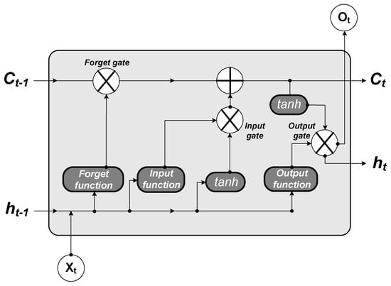 The LSTM model consists of a number of blocks. Each block includes cells representing the state over time, and three non-linear gates that regulate the flow of data: the forget gate (ft), input gate (it), and output gate (Ot). The LSTM computes the algorithms from an input sequence xt to output Ot by looping through Equations (4)–(9) with initial values of C0 = 0 and h0 = 0 [49].