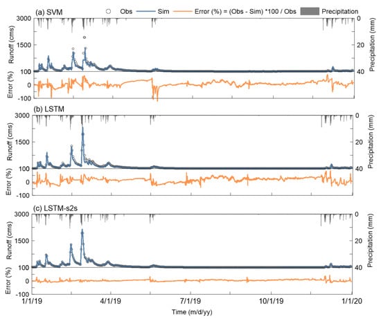 Observed and predicted runoff and errors with lead time of 1 h from three data-driven models. (a–c) indicate the results of SVM, LSTM, and LSTM-s2s models.