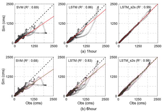 Figure 5 shows the scatter plots of observed and simulated runoff values with lead time of 1 and 6 h. As shown in Figure 5, the R2 values of the SVM, LSTM, and LSTM-s2s models are 0.69, 0.86, and 0.99 for lead time of 1 h. There were not significant differences in R2 values between lead times of 1 h and 6 h, and the R2 values of 6 h are relatively lower than the results of 1 h. Among the three models, the LSTM-s2s model has the highest values of R2 indicating that this model can simulate the relationship between simulated and observed runoff. For the runoff below 1250 cms, they are almost near the fit line, which means that these models can provide good performance for prediction of runoff below 1250 cms, while there is uncertainty in runoff prediction above 1250 cms for both SVM and LSTM models, as described in Figure 4.