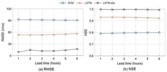 To compare the performance of three data-driven models for runoff forecasting, this study used two metrics, RMSE and NSE. Figure 6 shows RMSE and NSE resulting from SVM, LSTM, and LSTM-s2s models. As shown in Figure 6a, the RMSE values of both LSTM and LSTM-s2s increase with increasing forecast lead time. The SVM has not significant variations in RMSE value with lead time. Results showed that the LSTM-s2s has the lowest RMSE values for 1–6 h which are about 15–30% of the value of the SVM. In the case of the NSE (Figure 6b), the LSTM-s2s has largest values of the NSE which range from 0.97 to 0.99 for 1–6 h, while the SVM has lowest values below 0.8. Even though all results from these models clearly showed stable and good performance, the LSTM-s2s has the best performance for runoff forecasting for lead time of 1–6 h.