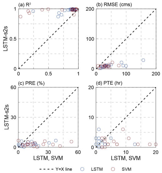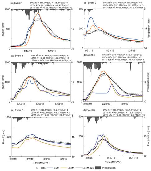 Figure 8 indicates scatter plots showing the performance of three models for event-based runoff prediction. As shown in Figure 8, it was found that LSTM-s2s model provides better predictive performance compared to LSTM and SVM models according to the evaluation metrics, R2, RMSE, PRE, and PTE, respectively. For example, the values of R2 of LSTM-s2s model ranged from 0.8 to 1.0, whereas the ranges were from 0.1 to 0.9 for SVM and 0.23 to 0.9 for the LSTM model. Furthermore, the values of PRE of LSTM-s2s model ranged from 1% to 6%, but both the SVM and LSTM models had values of 1% to 53% and 1% to 37%, respectively.
