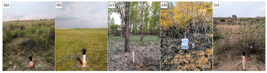 The dominate vegetations, i.e., (a) Achnatherum splendens, (b) Carex stenophylla, (c) Populus alba, (d) Salix psammophila and (e) Caragana korshinskii, in the study site.