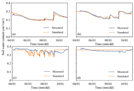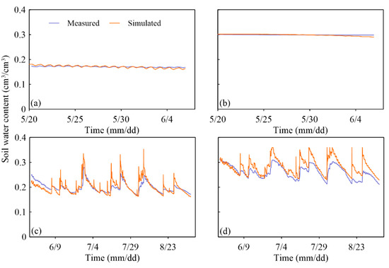 The measured and simulated data of soil moisture at (a) 60 cm depth and (b) 80 cm depth for K1, and (c) 50 cm depth and (d) 70 cm depth for K14.