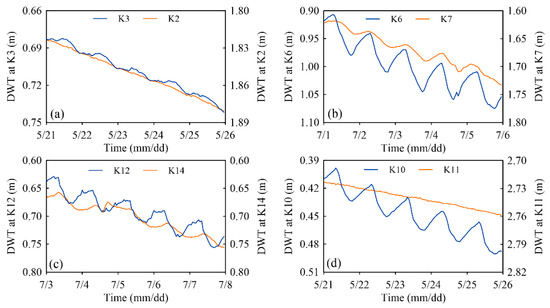 Vegetation condition is also a vital influencing factor of water level fluctuation pattern. For example, the daily amplitude of water table (3.7 cm) at K12 in the Populus alba site is larger than that (2.0 cm) at K14 in the Carex stenophylla site with the same average DWT of 0.70 m (Figure 6c). Furthermore, K10 is in the Carex stenophylla site and a sand dune at a distance of 20 m from K10 is free of vegetation. There is obviously water table fluctuation at K10 but no water table fluctuation at K11 (Figure 6d). The water table shows no fluctuation at K5 and K13 either, indicating that water table fluctuation is not influenced by other factors, such as tidal [44,45] and barometric pressure [46].