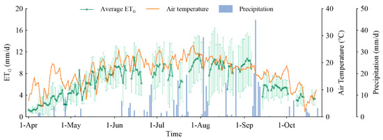 Meteorological data (i.e., solar radiation, air temperature, air humidity, and wind speed) were monitored at one-hour intervals by a meteorological station (HOBO-U30, Onset, USA) at the southeast of study site. Hourly reference evapotranspiration (ET0) was calculated by the Penman–Monteith equation (Equation (1)) using the meteorological data [23].
