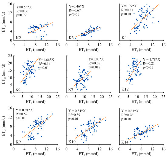 ET0 reflects the combined effect of individual meteorological variables because it is determined by solar radiation, air temperature, relative humidity, and wind speed (Equation (1)). As shown in Figure 8, ETG has a linear positive correlation with ET0 in each observation well. The slope of the linear expression of them are considered to be the parameter that reflects the relationship between ETG and ET0, and they are different among the wells. The slope in K6, K7, and K12 are bigger than one (ranging from 1.03 to 1.78), indicating that the daily ETG in these wells are generally larger than daily ET0. The possible explanation is that the vegetation in K6, K7, and K12 are trees that have larger ETG than grass. While K4 is close to the lake with dense grass, resulting in the larger ETG. The slope in the other wells ranges from 0.46 to 0.91. It reflects that the proportion of ETG and ET0 shows obvious spatial difference. However, the coefficient of determination (R2) of the linear expressions is not suitable for all wells, ranging from 0.06 to 0.67, resulting from other factors influencing ETG. For example, R2 are 0.06 and 0.08 in K2 and K7, respectively, where DWT is larger.
