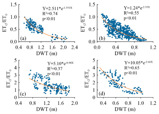 The relationship between the ratio of ETG to ET0 (ETG/ET0) and DWT for (a) the Achnatherum splendens site, (b) the Carex stenophylla site, (c) the Salix psammophila site, and (d) the Populus alba site.