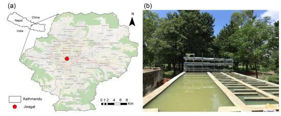 The Kathmandu Valley is situated between the latitudes 27°32′13″ and 27°49′10″ N, and the longitudes 85°11′31″ and 85°31′38″ E. The study area, Jwagal, is located in the middle of the Kathmandu Valley (Figure 1). In Jwagal, Kathmandu Upatyaka Khanepani Limited (KUKL) operates a water treatment unit to extract deep groundwater for intermittent distribution. The extracted groundwater is treated by aeration, coagulation and flocculation, sedimentation, sand filtration, and chlorination, as shown in Figure 2, before distribution to households.