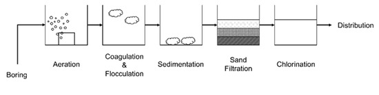 Table 1 summarizes the groundwater quality of Jwagal, with data partially adapted from previous reports [11,37]. As can be seen in Figure 1b, the groundwater is turbid. The groundwater is heavily contaminated by NH4+–N at concentrations ranging from 41.2 to 57.3 mg–N/L, which exceeds the drinking water standard (1.2 mg–N/L) set by the World Health Organization (WHO) [16], and which cannot be removed by the current treatment process [9]. Thus, a nitrification system described by the Japan International Cooperation Agency (JICA) in 2019 [38] was supplementarily installed after the sedimentation system to remove NH4+–N from the groundwater.