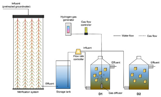 Recently, hydrogenotrophic denitrification (HD), which is a type of autotrophic denitrification, has drawn much attention as a promising technology for nitrate removal from groundwater [19,21,23,24,25,26,27,28,29,30,31,32,33,34,35,36] because it offers certain advantages over heterotrophic denitrification systems. First, biomass generation can be reduced, thereby reducing clogging and the cost of post-treatment [33]. Second, there is no production of toxic waste as HD is a clean process [21,24]. Third, organic carbon is not necessary, leading to lower operational costs and lower risk of secondary contamination [23]. Fourth, H2 is economical for nitrogen removal per electron equivalent compared to other electron donors [23,33].