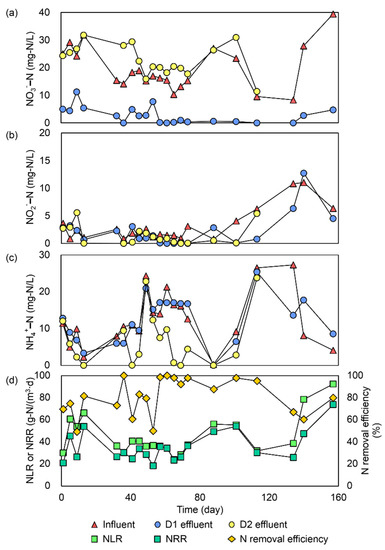 In this study, NH4+–N concentration was not considered for NLR, NRR, or nitrogen removal efficiency, as HD is not meant to remove NH4+–N, and the difference in NH4+–N concentrations between the influent and effluent were not significant. Furthermore, the NH4+–N observed in the influent is attributed to the degraded performance of the nitrification system (NH4+–N concentrations should be less than 1.2 mg–N/L for drinking water).