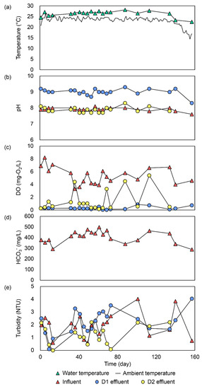 Figure 5a shows the variation of the average ambient temperature and the water temperature inside the reactors. The ambient temperature varied in the range of 14.4–26.5 °C, while the water temperature ranged from 22.5 to 28.1 °C. It is known that denitrification can occur over a wide range of temperatures, from 2 to 50 °C [45], and that HD occurs at temperatures between 15 and 50 °C [46]. Although a higher nitrate removal rate was obtained at higher temperatures [46], the HD efficiencies were maintained at a certain level (>70%) with a water temperature range of 15–30 °C [31]. In the present study, the water temperature inside the reactor stayed within this range for HD performance without temperature control.