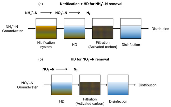 Groundwater in the Kathmandu Valley is contaminated by NH4+–N and NO3−–N, as previously reported [11,12,13,14,15]. NH4+–N removal can be conducted by combining the previously developed nitrification system [18,19,20] and the simplified HD reactor developed in this study (Figure 6a), whereas NO3−–N removal can be performed using the simplified HD reactor alone (Figure 6b). However, the simplified HD reactor sporadically emitted an odor during operation, which might affect the acceptability of the treated water. Therefore, filtration with activated carbon, followed by disinfection, is recommended for installation after the simplified HD reactor. The filtration with activated carbon is to remove the odor, turbidity, and dissolved organic compounds (if any) [40]. The activated carbon is recommended to be replaced on a yearly basis [40]. Although chlorination is more common in Nepal for water disinfection, ultra-violet (UV) disinfection could be a better alternative for household scale.