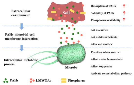 In this review, we explored different LMWOAs, introduced factors for degrading PAHs, classified them according to the process of biodegradation (Figure 1). The latter include (1) the behavior of PAHs and other chemicals in the extracellular environment, (2) interactions between PAHs and the microbial cell surface, and (3) the intracellular metabolization of PAHs. We discuss each approach in a dedicated section and highlight examples in which LMWOAs have found their way into improving efficiency as stepping-stones for future developments. We critically discuss the current status of LMWOAs in the bioremediation of PAHs. Finally, we propose promising directions from the understanding of the regulated mechanism in microorganisms by LMWOAs to microbe modification based on genetically edited for further development of the field.