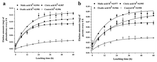 Soil flushing/washing, as an in situ chemical method of soil remediation, involves the extraction of PAHs via a fluid that was injected into the contaminated soil. LMWOAs as additives have been employed to remediate PAHs polluted soils through integrating into the soil flushing/washing technology [42,47,87]. For instance, Jia et al. observed that LMWOAs markedly promoted the release of phenanthrene and pyrene from sediment columns and, therefore, led to bioavailability enhancement (Figure 3). In detail, citric acid showed the best elution strength. With the increase in the concentration of citric acid from 0 to 160 mmol/L, the phenanthrene and pyrene in leachates enhanced from 0.045 and 0.039 mg to 0.125 and 0.087 mg, respectively [42]. Moreover, LMWOAs (e.g., acetic acid, oxalic acid, tartaric acid, and citric acid) promoted phenanthrene desorption in the soil–water system. Falciglia et al. applied citric acid as enhancers to break up calcium carbonate on the surface and thus accelerate the washing step to remove PAHs from seabed sediments [87]. These studies stressed the importance of LMWOAs involved in soil washing technologies to deal with the PAH-contaminated sites [47].