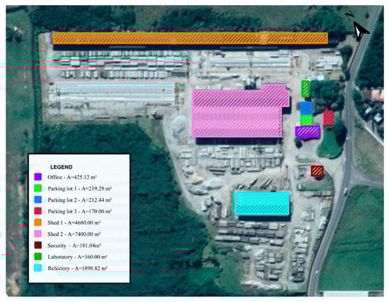 Layout of the roofs of the factory and their corresponding areas. Source: Image from Google Earth generated by the authors in 2018.