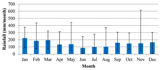 Daily rainfall data from September 2001 to July 2018—approximately 17 years of data—were used in the analysis. The annual rainfall over 2002 and 2017 is shown in Figure 2. The average annual rainfall over that period was 1775 mm. The average monthly rainfall, as well as the minimum and maximum for each month, are shown in Figure 3. The month with the highest rainfall was January (223 mm); the lowest was June (85 mm). Although rainfall distribution is not homogeneous along the year, long dry periods were not observed, which indicates that it is possible to collect rainwater during all seasons of the year.