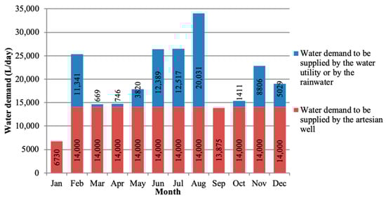 Table 3 shows the water demand that can be supplied with rainwater, representing the amount that exceeds the 14,000 L of daily consumption. Figure 4 shows the amount of water that can be supplied by the artesian well, as well as the amount of water that will be supplied with water from the water company and that can be replaced with rainwater.