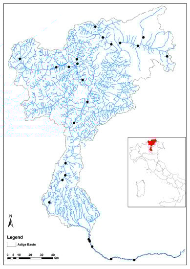 The Adige river flows for 410 km, and it is the second longest river, hosted in the third largest watershed (12,200 km2) in Italy. The spring is near the Lake Resia at 1586 m a.s.l., and the river reaches the Adriatic Sea at the south of Venice lagoon. The hydrological regime follows the typical pattern of alpine rivers, with higher discharges in summer due to snow melt. The higher values of mean monthly discharge at lower gauge station (located in Boara Pisani) occur in June with a decreasing trend (373 m3/s for the period 1928–1990 and 292 m3/s for the period 2004–2016). The Adige basin (Figure 1) includes 8 tributaries, mainly flowing in the upper section, characterized by a forest-dominated landscape. The upper section of the river is surrounded by typical alpine landscape features, and it is mainly impacted by hydropower dams, while its mid and lower sections are stressed by the nutrients’ leaching by the intensive agricultural activities and livestock farming. The dramatic rise of fertilizer rates in the basin in the last decades severely harmed ecosystem services and water quality [19], representing a stressor of increasing relevance.
