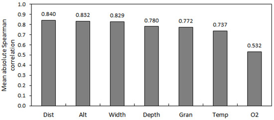 The Spearman correlations among environmental variables of Table 2 are given in Table 3, where the very low and non-significant correlation of NO3− and NH4+ with all the rest environmental parameters is observed. On the other hand, all the rest parameters Alt, Gran, Dist, Width, Depth, Temp and O2 present statistically significant correlations. Among them, Dist parameter presents the higher mean absolute value of Spearman correlations with all the rest parameters without considering NO3− and NH4+ (Figure 2). These results show that Dist can adequately describes the effects of topography, hydromorphology and physical water parameters but not those associated to chemical water parameters that are closely associated to human activities like agriculture.