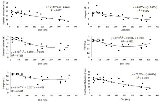 Most fitted regression models between Distance from the source and the community index (S—Species richness; N—Individuals abundance; H′—Shannon–Wienner Index; d—Margalef Index; J—Pielou Index; λ—Simpson Index; FRic—Functional Richness; FEve—Functional Evenness; RaoQ—Rao Quadratic Entropy) (Exp—exponential; Pol—Polynomial).